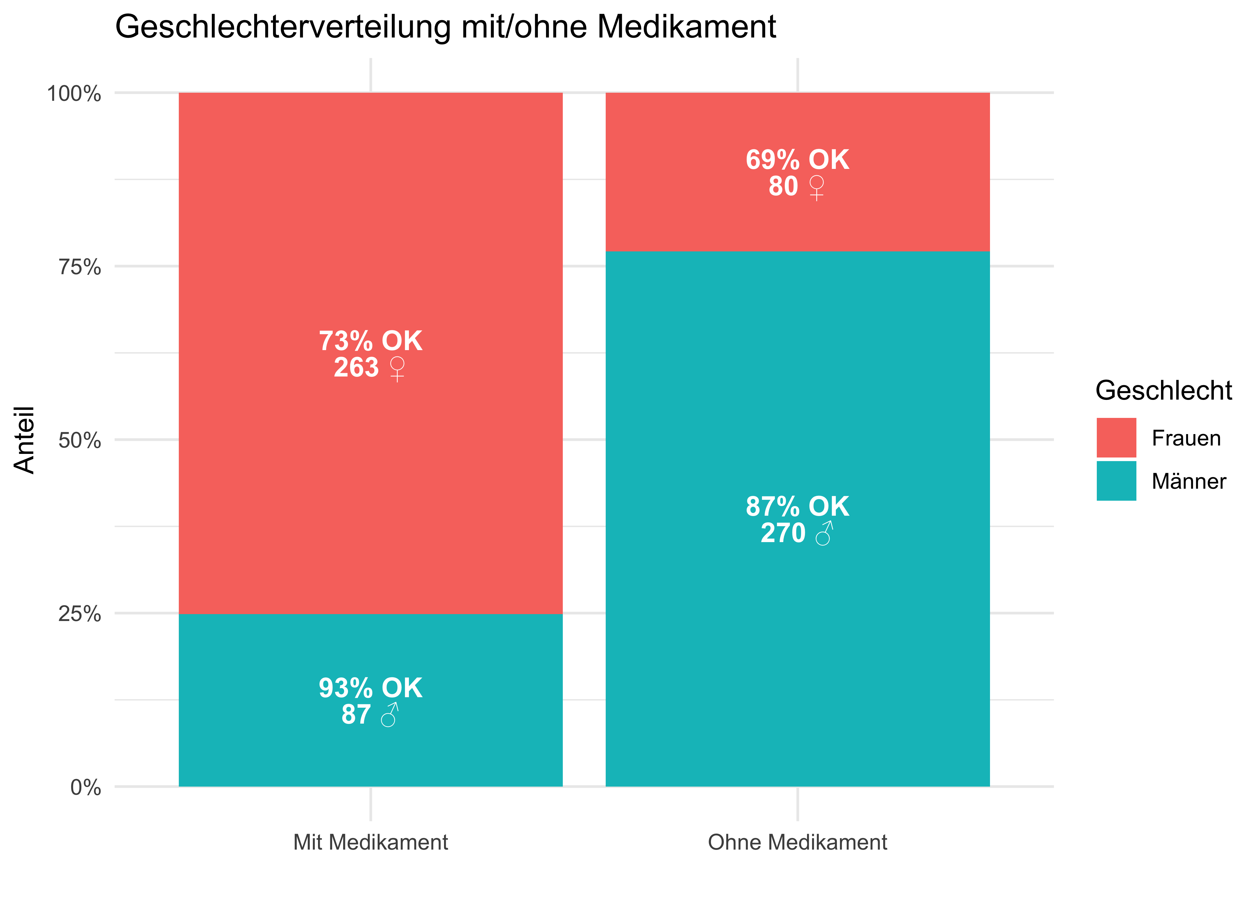 Aufteilen in Teilgruppen (Männer bzw. Frauen) ist also in diesem Fall der korrekte, richtige Weg. Achtung: Das Stratifizieren ist nicht immer und nicht automatisch die richtige Lösung. Stratifizieren bedeutet, den Gesamtdatensatz in Gruppen oder “Schichten” (“Strata”). Würde man die Gesamzahl an Patienten mit vs. ohne Medikatment vergleichen, käme man zu einem falschen Schluss.