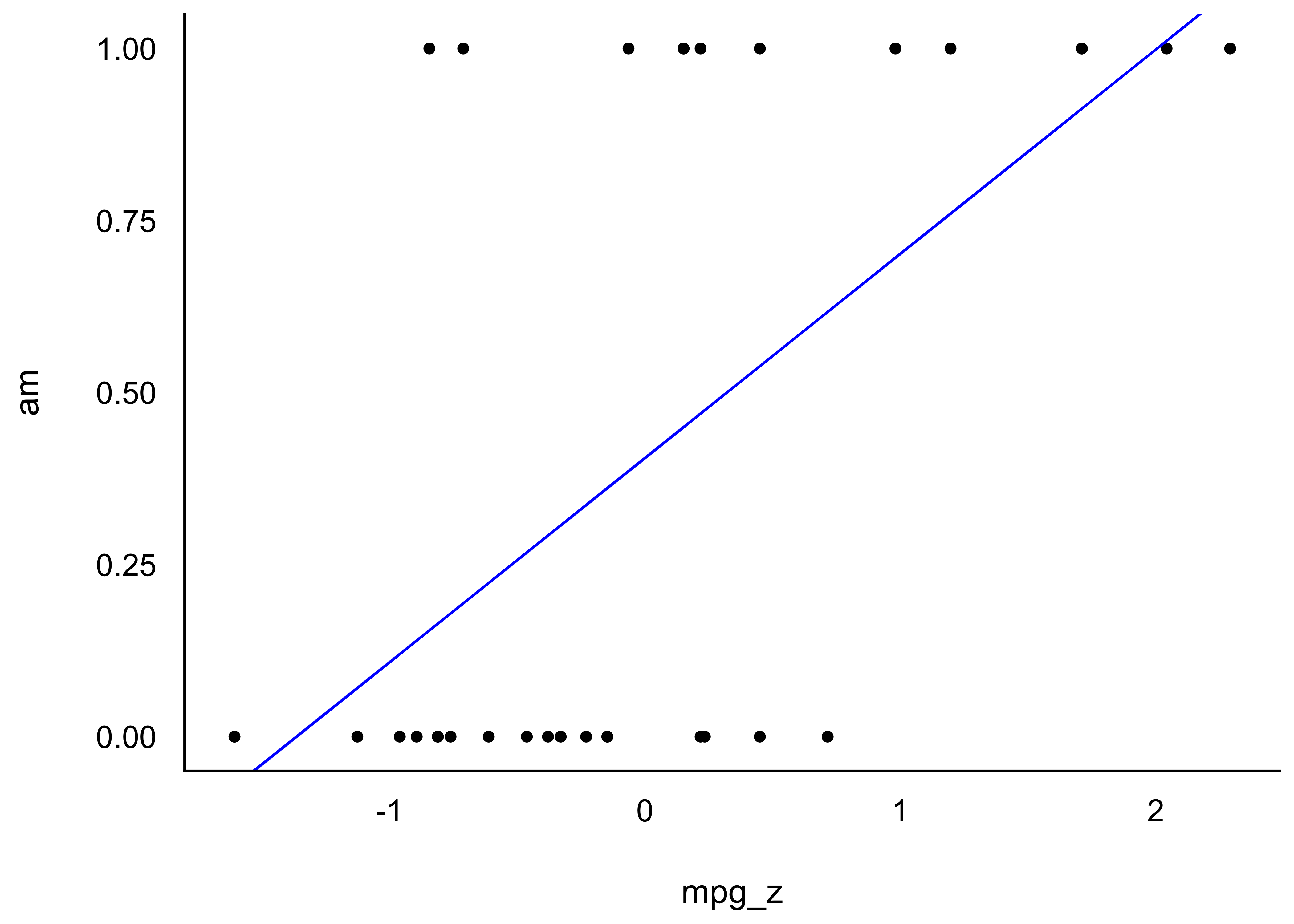 Dann berechnen wir mit Hilfe von Stan ein Regressionsmodell: m14: am ~ mpg_z